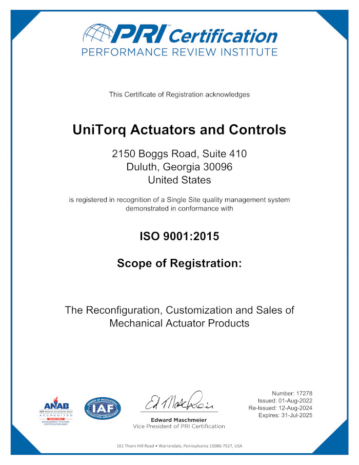 ISO 9001:2015 certification for UniTorq provides customers with several benefits, including product and service quality assurance, as UniTorq adheres to a globally recognized standard for quality management. It also enhances customer confidence by demonstrating UniTorq’s commitment to continuous improvement. The standard promotes efficiency and operational excellence, leading to faster delivery times, improved product reliability, and superior customer service. The ISO 9001:2015 certification affirms UniTorq’s dedication to consistently meeting customer needs and enhancing satisfaction.